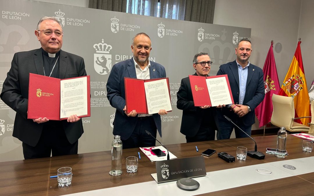 - El presidente de la Diputación firmó junto al obispo de León y el administrador diocesano de Astorga el convenio que regula la nueva edición de un programa bienal que ve aumentado su presupuesto en un 20% y cuyos principales objetivos siguen siendo la restauración de los templos en peor estado y el refuerzo de su misión social y cultural