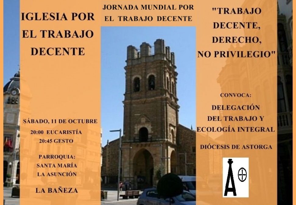 Este sábado 11 de octubre se celebrará, a las ocho de la tarde en la parroquia de Santa María de La Bañeza, la Eucaristía con motivo de la Jornada por el Trabajo Decente en la que cada año la Iglesia tiene un especial recuerdo hacia los trabajadores/as.