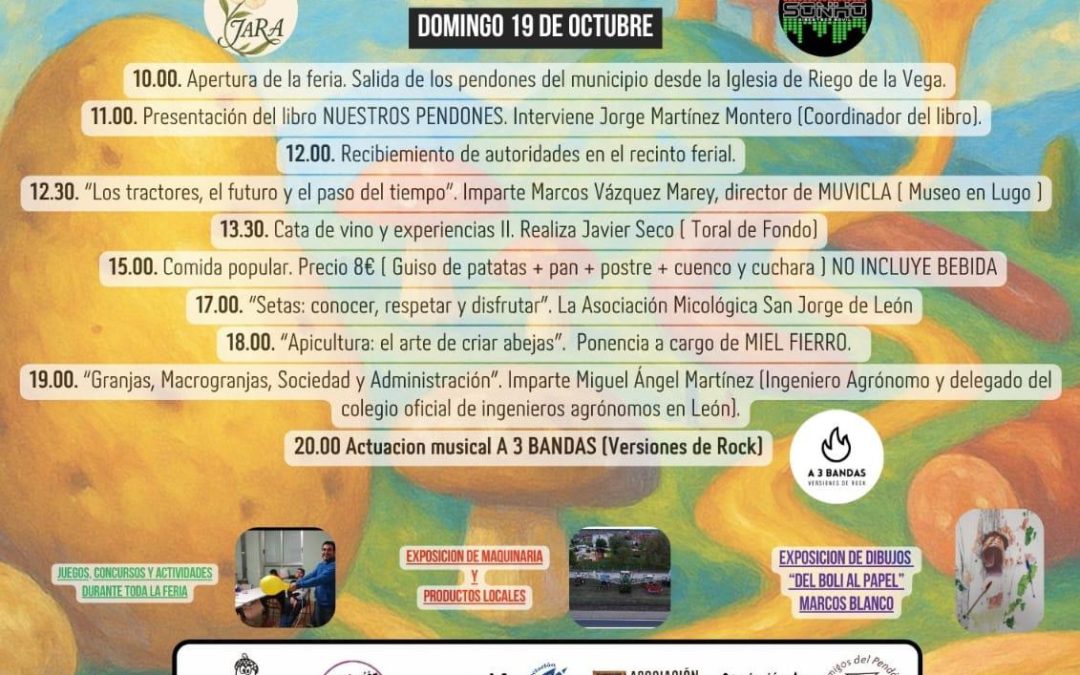 Por la tarde, la programación continuará con la ponencia “Setas: conocer, respetar y disfrutar”, de la Asociación Micológica San Jorge de León, una charla sobre apicultura ofrecida por Miel Fierro, y la conferencia “Granjas, macrogranjas, sociedad y administración”, a cargo de Miguel Ángel Martínez, ingeniero agrónomo y delegado del Colegio Oficial en León. La música volverá a poner el cierre, esta vez con la actuación del grupo “A 3 Bandas”, que ofrecerá versiones de rock desde las 20.00 horas.