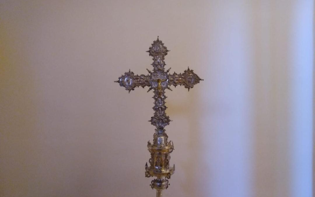 Cruz latina de brazos rectos, perfil decorado con temas vegetales y cabezas de angelitos, pináculos torneados en los extremos y cuadrón central. En el anverso, las expansiones de los brazos se resuelven con cartelas que enmarcan espejos ovalados. Las terminaciones, también con cartelas, insertan el pelícano alimentando de sangre a sus polluelos, a María Magdalena y La Dolorosa y San Juan en los laterales. Sobre el cuadrón central, el Crucificado.
