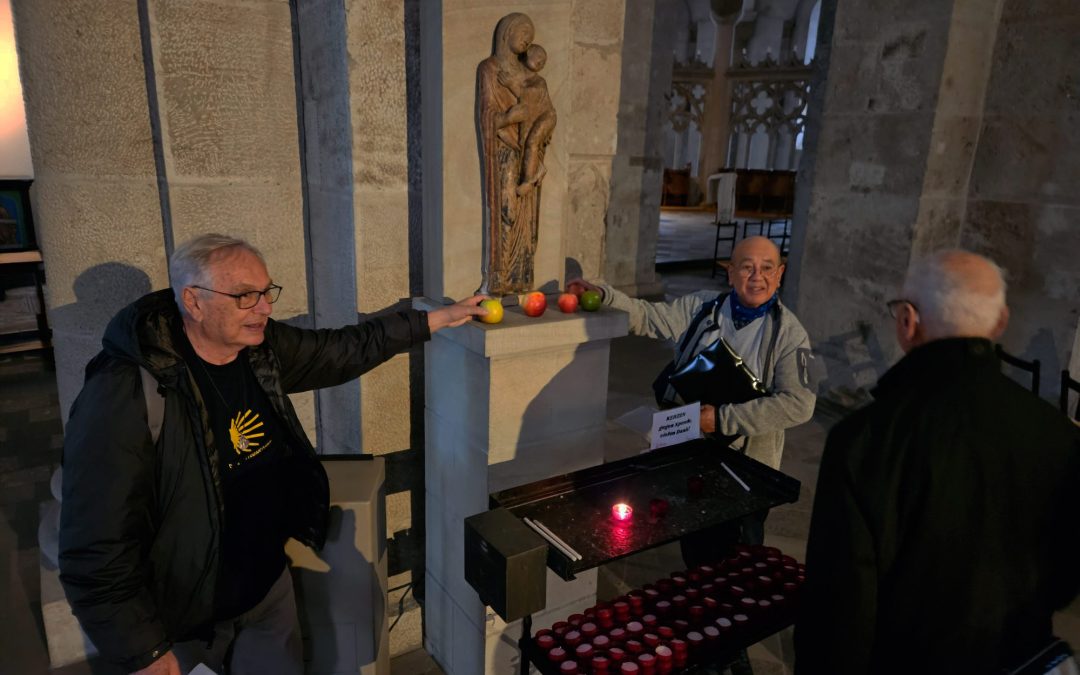 En el encuentro celebrado en el DOMFORUM, participó Norman Sinclair, peregrino de Lengerich (Alemania), quien desde hace varios años ha venido poniendo sus “rosas peregrinas” por distintas sendas y ciudades, entre ellas la propia Colonia. El grupo se dirigió con posterioridad hasta la iglesia románica de St. María im Kapitol, ante cuya entrada crece precisamente una de dichas rosas.