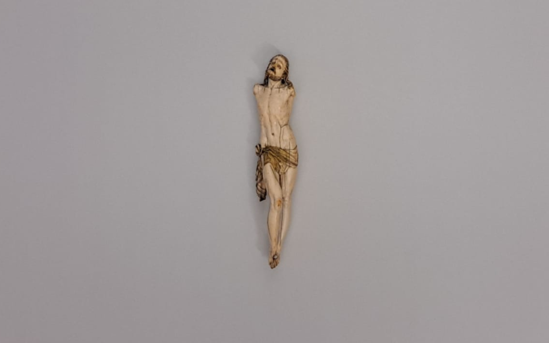 Se trata de un Cristo de marfil indio, sin brazos ni cruz, correspondiente a la tipología de expirante: cabeza levantada, boca abierta, arcos supraciliares elevados y frente estrecha. Cabello en “V” invertida, con bucles y pectorales levantados, vientre hundido y piernas tensas.