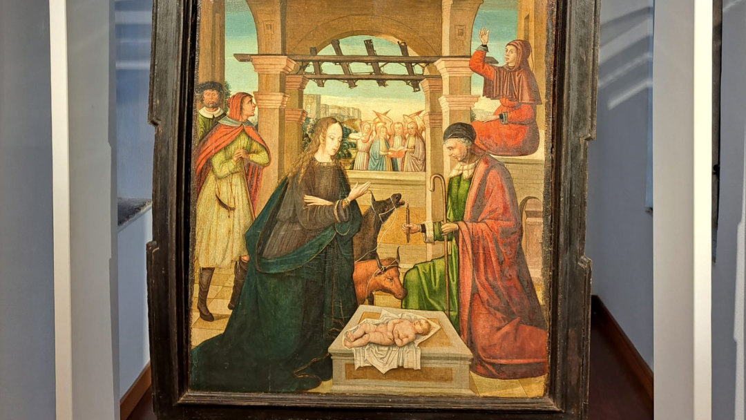 Dos pastores acuden a venerar al Niño, con un vestuario propio de las gentes del campo de finales del siglo XV y principios del XVI. Un coro de ángeles aparece al fondo y a la izquierda un personaje que pudiera ser el donante, por vestir con ropa de un extracto social más elevado.